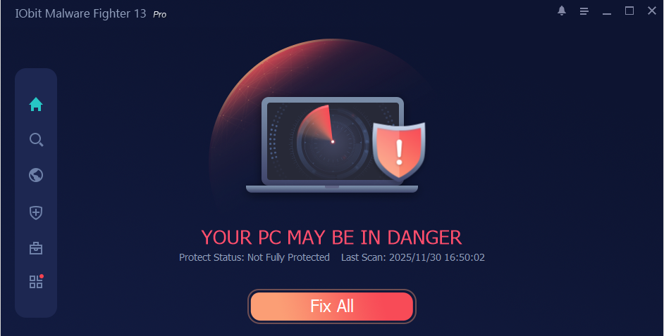 3. PC は危険な状態です - IObit Malware Fighter が完全には機能していません。次のような状況で表示されます: