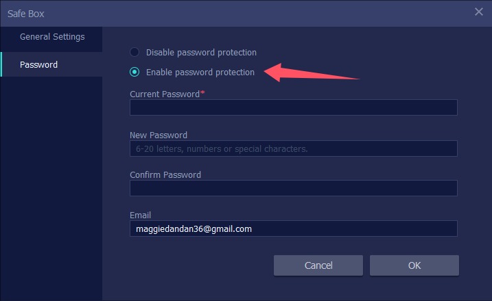 インストール後、初めてセーフボックスを開くとパスワードの設定を求められます。パスワード保護を有効にする場合は、関連する情報を入力する必要があります。以下をご参照ください。